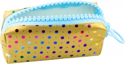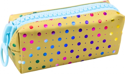 Školní penál ve zlatém provedení s barevnými tečkami kombinuje moderní design s praktickým řešením pro ukládání školních pomůcek. Jeho živý a vesele laděný design činí penál atraktivním pro děti a mládež, kteří si cení originálního stylu.