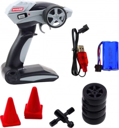 Součástí sady je i náhradní sada pneumatik, klíč pro jejich výměnu a kužely pro nácvik driftu. Tento model rozvíjí motorické schopnosti, reflexy a vášeň pro techniku a sportovní jízdu.