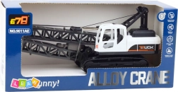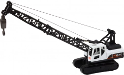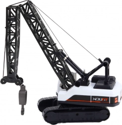 Jeřáb má pohyblivé rameno s hákem, které lze zvedat a spouštět. Rameno jeřábu se pohybuje na kloubech a otočná základna umožňuje plný otáč o 360°. Celá konstrukce je postavena na pevném pásovém podvozku, což zvyšuje realismus a stabilitu. Hračka je navržena v bílo-černé barevnosti s detaily napodobujícími profesionální stavební vybavení.