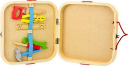 Set obsahuje základní nástroje jako pilka, kladivo, šroubovák, plochý klíč, kleště a pravítko, a také barevné montážní prvky – šroubky, matice a dřevěné bloky s otvory, které může dítě snadno šroubovat a spojovat.