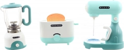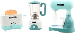 Zábavná sada kuchyňských spotřebičů pro malé kuchaře obsahuje mixér, šlehač a topinkovač na baterie. Hračky vydávají světelné a zvukové efekty a mají pohyblivé části, které věrně napodobují skutečné spotřebiče. Ideální pro rozvoj fantazie a role-play u dětí od 3 let.