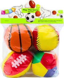 Měkké sportovní míčky jsou ideální pro malé děti - jsou bezpečné, barevné a podporují pohybovou aktivitu. Tato sada obsahuje čtyři různé míčky, které napodobují klasické sportovní hračky.