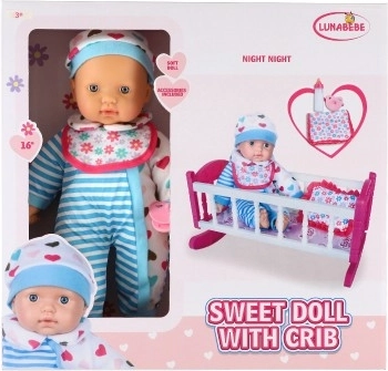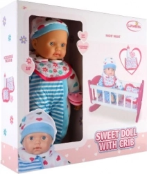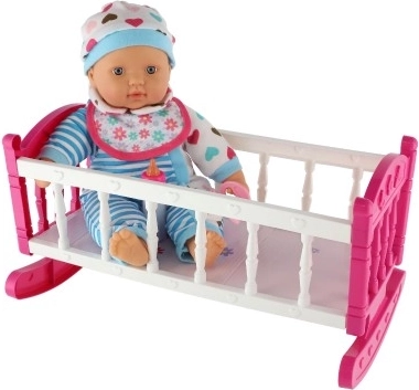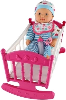 Tentokrát přinášíme jedinečnou panenku s kolébkou, která bude skvělým doplňkem do herního světa každého dítěte. Měkké tělíčko panenky umožňuje snadnou manipulaci a přenášení, což dodává realismu pohybům při hře. Růžová kolébka s bílými pruhy a srdíčkovým motivem je ideální pro uspávání panenky, zatímco doplňky jako lahvička a dudlík navozují realistický zážitek z péče o miminko.