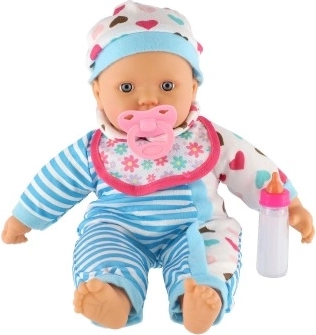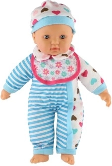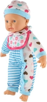 Panenka je obléknutá v modro-bílém pruhovaném oblečku s roztomilými srdíčky. Je vybavena dudlíkem a lahvičkou, což dodává hře realistický prvek.