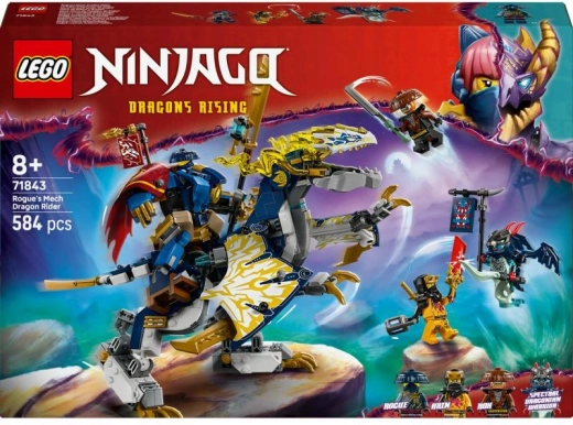 Objevte dynamický svět NINJAGO s přestavitelným setem, který umožní dětem od 8 let přehrávat scény ze 3. řady seriálu Povstání draků. Samostatně ovladatelný mech s mečem i dračí stroj s pohyblivými křídly, hlavou, čelistí, nohama a ocasem lze spojit do impozantního Mecha dračího jezdce Rogue. O napínavé bitvy se postarají 4 minifigurky včetně protivníků Roxe a bojovníka Spektrálních draků se standardem s tajným vzkazem.