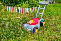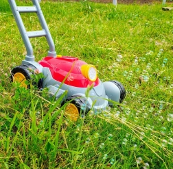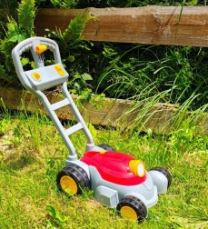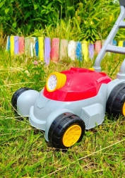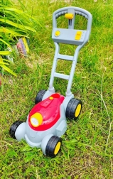 Pevná plastová rukojeť a velká kola usnadňují tlačení po zahradě. Lehká konstrukce je ideální pro malé ruce.