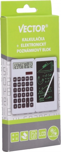 Kombinace kalkulačky a elektronického poznámkového bloku Vector poskytuje ideální řešení pro efektivní práci a organizaci, s možností duálního napájení pro pohodlné použití kdekoliv.