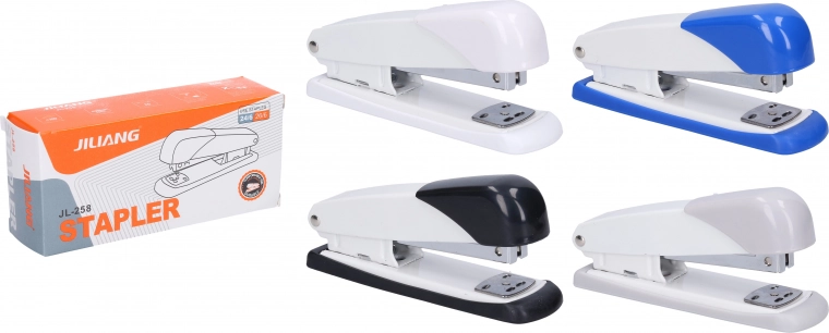 Univerzální sešívačka dostupná ve čtyřech barevných variantách: modrá, šedá, bílá a černá, ideální pro každodenní používání.