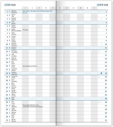 - Obsahuje pracovní kalendář, seznam jmen a přehled na roky 2026 a 2027