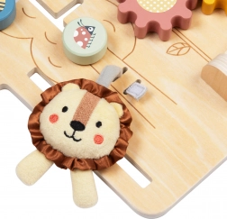 - ozubená kolečka, posuvné kostičky se zvířátky, posuvné disky s hmyzem, zrcátko, duhový oblouk s korálky, otočný váleček s kuličkami, otvírací okénko, plyšová hlavička lva