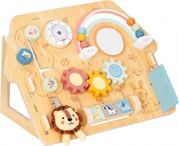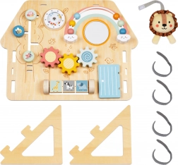 Dřevěná manipulační tabule ve tvaru domečku přináší dětem od 1 roku hodiny objevování a her. Podporuje jemnou motoriku, senzorický rozvoj i koordinaci oko–ruka díky pestré škále aktivit: ozubená kolečka, posuvné prvky, zrcátko, korálky na duze či otočné válečky. Vyrobena z kvalitního dřeva a navržena tak, aby byla bezpečná pro nejmenší.
