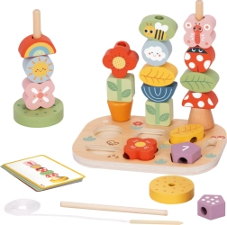 Navlékání, třídění tvarů a barev, stavění věží na kolících, párování i hra podle předloh – vše v jednom kompaktním setu pro každodenní objevování.