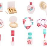 - Součástí sady jsou dřevěné doplňky: lak na nehty, rtěnka, náramek, náušnice, kartáč na vlasy, parfém, pudřenka a oční stíny.