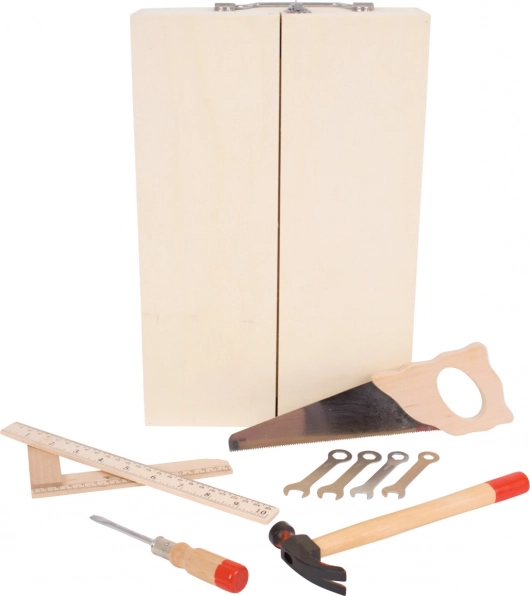 Dřevěný kufřík s nářadím obsahuje vše, co mladý kutil potřebuje. Obsahuje šroubováky, pily, klíče, kladiva, a mnoho dalších nástrojů. Vyrobeno z kvalitních materiálů a splňuje evropské bezpečnostní normy.
