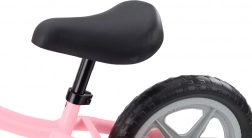 Konstrukce s pevnou ocelovou rámovou trubkou a tichými EVA koly 12" zajišťuje plynulou a komfortní jízdu bez rizika defektu. Nastavitelná výška sedla (33,5–48 cm) a řídítek (51–56 cm) dovoluje přizpůsobit odrážedlo aktuální výšce dítěte. Šířka řídítek 41 cm a krátký dosah ke gripům podporují jisté ovládání.