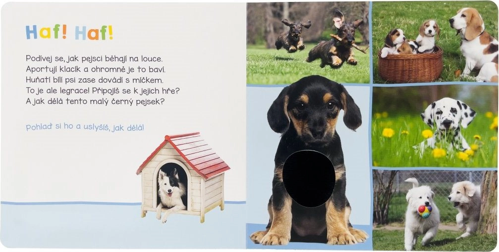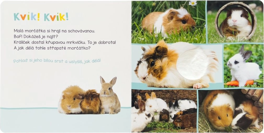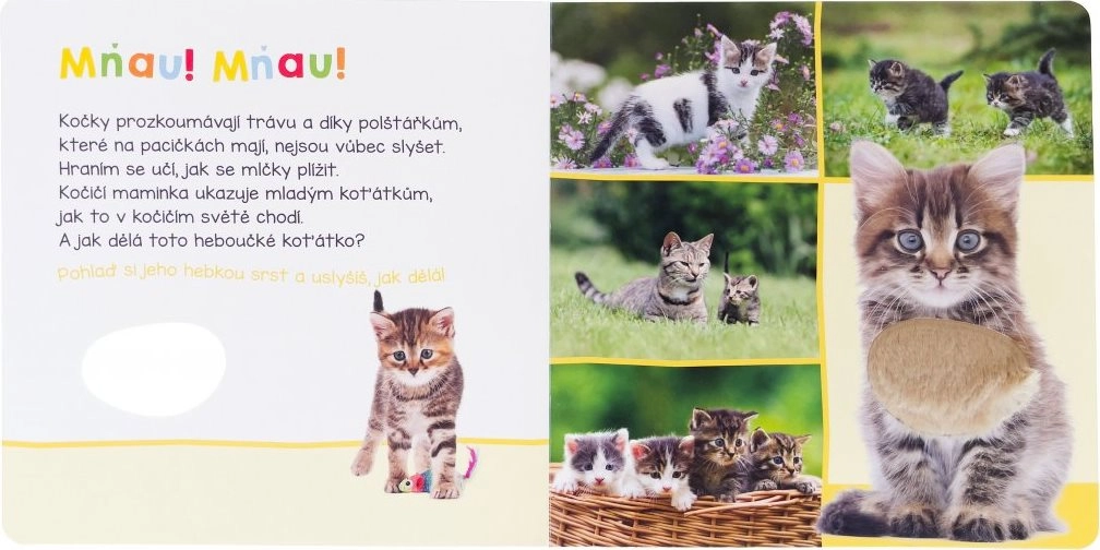 Zvuková kniha s domácími mazlíčky přináší zábavu i poučení. Děti mohou nejen vidět a slyšet skutečné zvuky zvířat, ale díky hmatovým prvkům i cítit jejich srst.