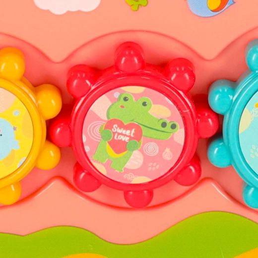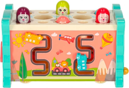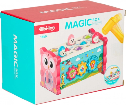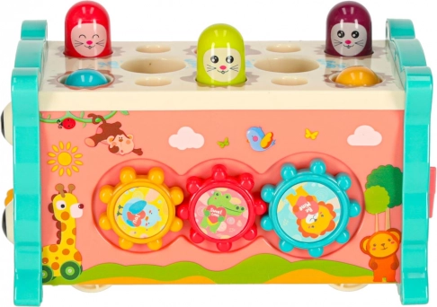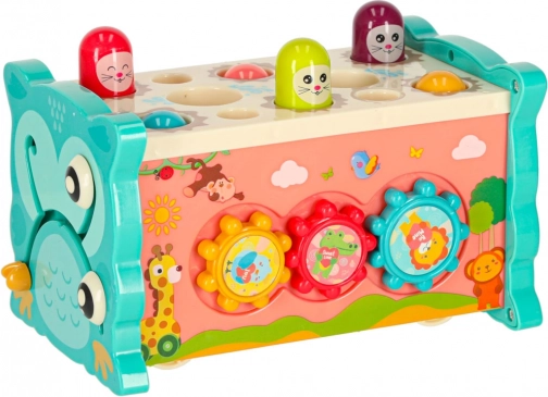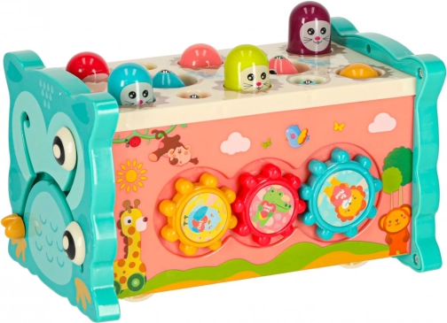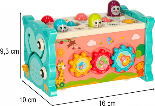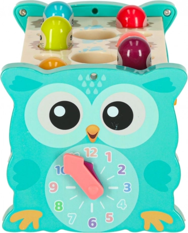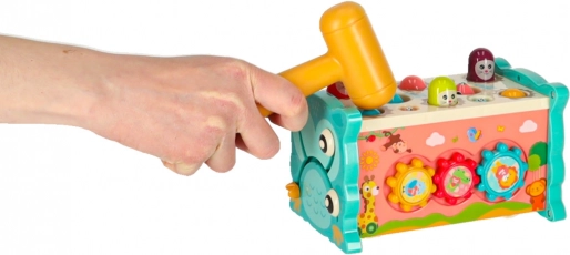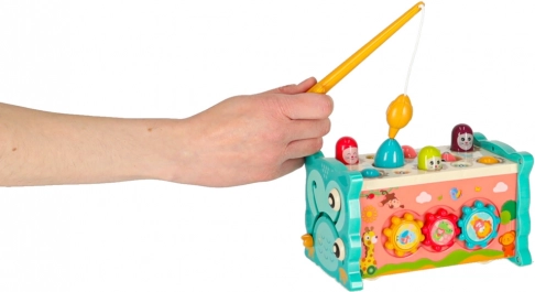 Tato interaktivní hračka zaručuje dlouhé hodiny zábavy! Jedním z hlavních prvků je možnost vklepat malé krtečky kladivem, které vyskakují, což dodává dětem radost a zlepšuje jejich reflexy. Hračka také umožňuje chytat barevné rybičky a červíky pomocí přiložené prutem, což pomáhá rozvíjet preciznost a trpělivost. Děti se také mohou naučit základy hodin, otáčet barevnými ozubenými kolečky a pohybovat autíčky v bludišti. Díky různorodým aktivitám sada zaručuje mnohahodinovou zábavu, přičemž stimuluje dětství smysly intenzivními barvami a rozmanitými tvary.