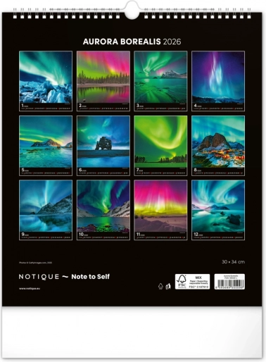 Nástěnný kalendář Polární záře 2026 s 12 snímky. Zažijte severní světla po celý rok. Rozměry 30 x 34 cm.