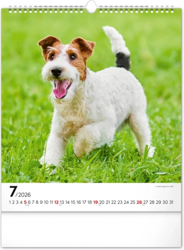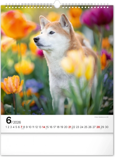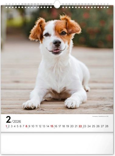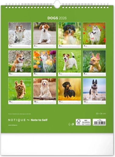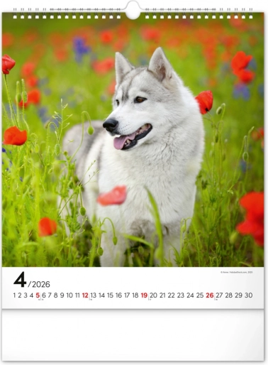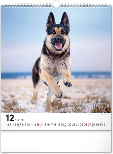 Nástěnný kalendář Psi 2026 je ideální volbou pro milovníky psů. Nabízí krásné snímky dvanácti různých psích plemen na bílém pozadí.