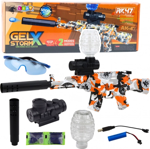 Tato karabina je vybavena vyměnitelnými zásobníky na gelové kuličky a optickým zaměřovačem, což zaručuje vzrušující hru na čerstvém vzduchu nebo doma (s příslušným zabezpečením prostoru). Díky napájení z akumulátoru 3.7V Li hračka nabízí pohodlné používání bez nutnosti časté výměny baterií.