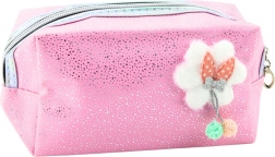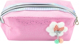 Toto pouzdro na kosmetiku či školní potřeby je vyrobeno v elegantním růžovém odstínu a ozdobeno jemnými třpytkami. Na přední straně se nachází roztomilá aplikace ve tvaru nadýchaného obláčku s mašličkou, ke které jsou připojeny dvě dekorativní kuličky, jež dodávají celkovému vzhledu jedinečný půvab.