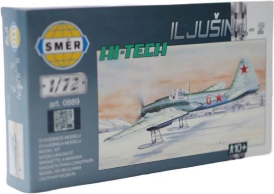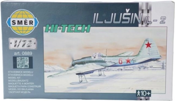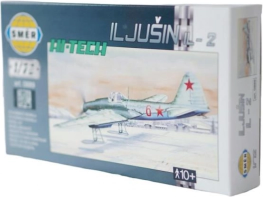 Slepovací stavebnice Iljušin IL-2 1:72 s 126 díly a kovovými částmi. Délka 16,1 cm, rozpětí 20,3 cm, 3 značení USSR. Lepidlo a barvy nejsou součástí.