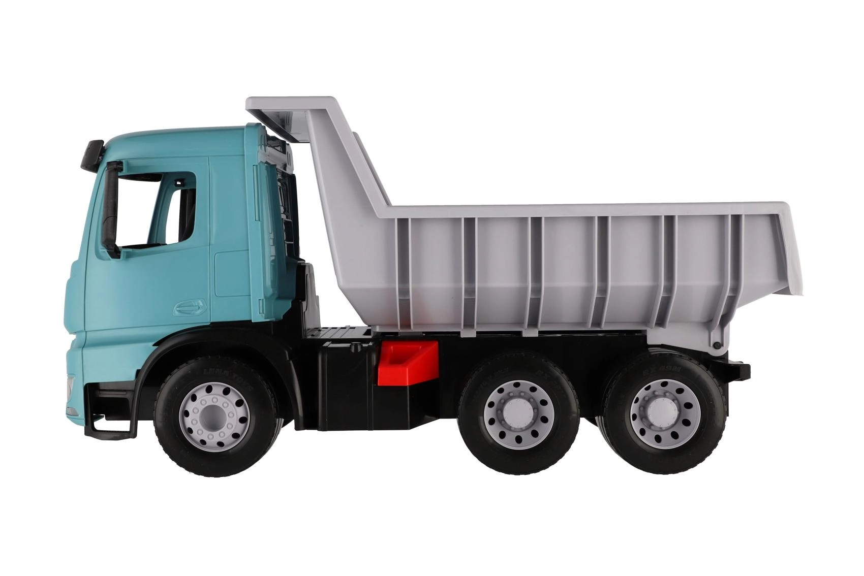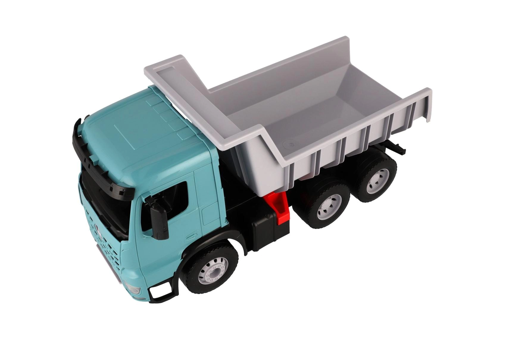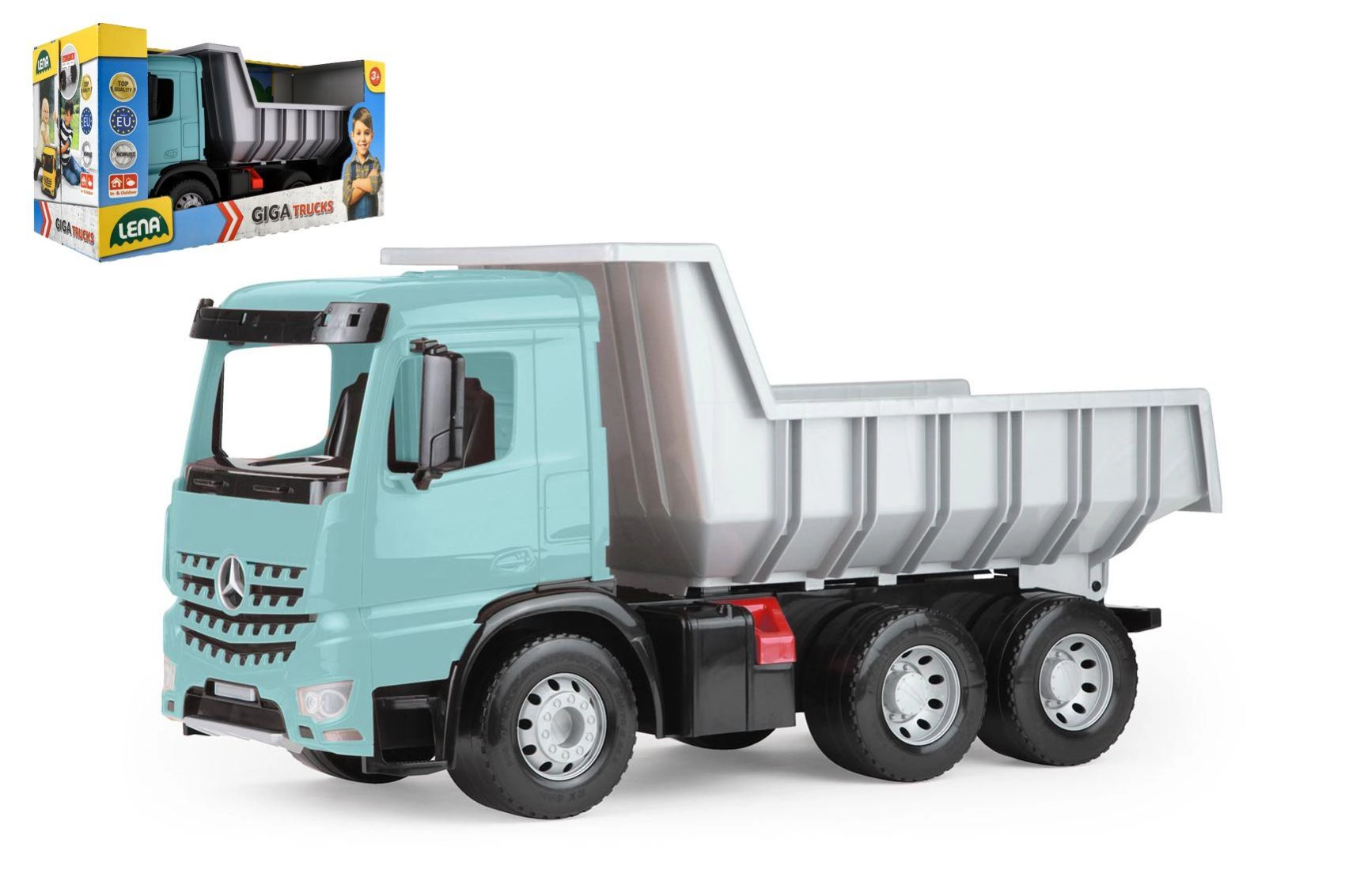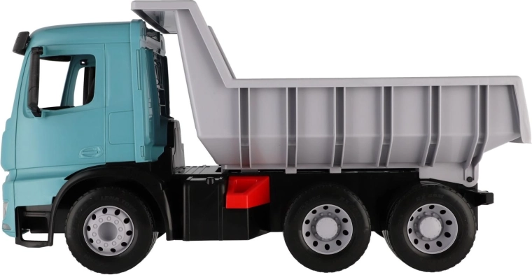 Velký plastový sklápěč pro děti od 3 let s realistickým vzhledem vozu MERCEDES-BENZ AROCS. Nabízí prostornou korbu s praktickou pojistkou proti samovolnému vyklopení, odolnou konstrukci z kvalitního plastu a moderní tyrkysovo-šedé provedení. Ideální pro hraní doma i venku, pro převoz písku, hraček i fantazie.