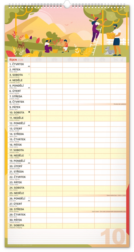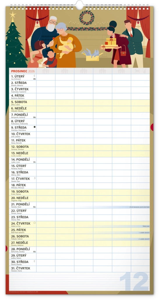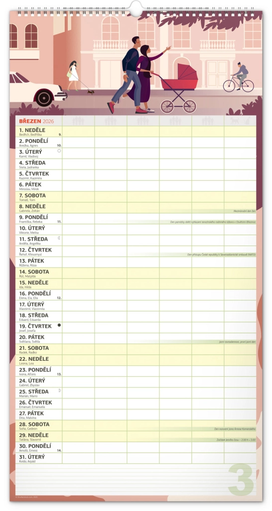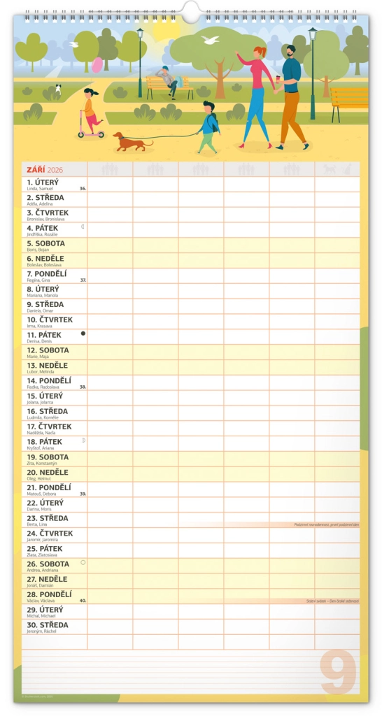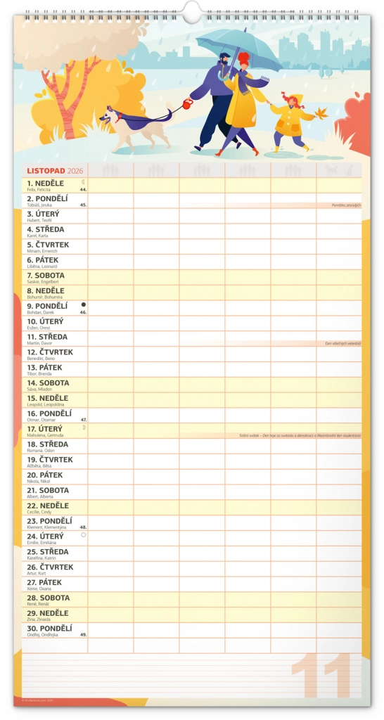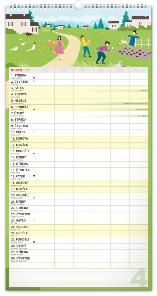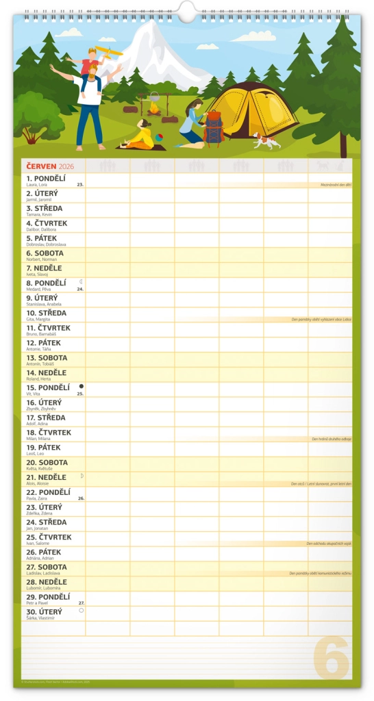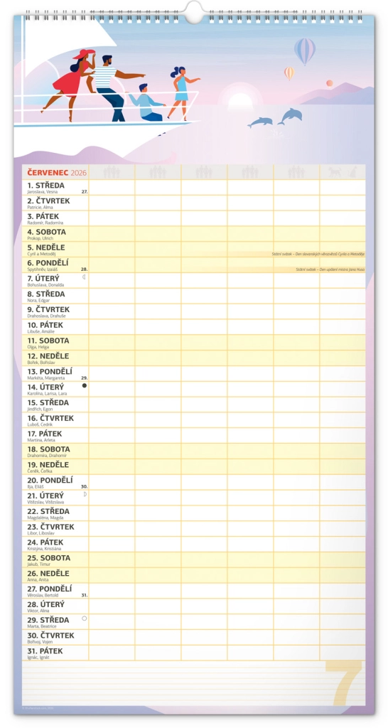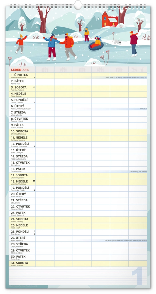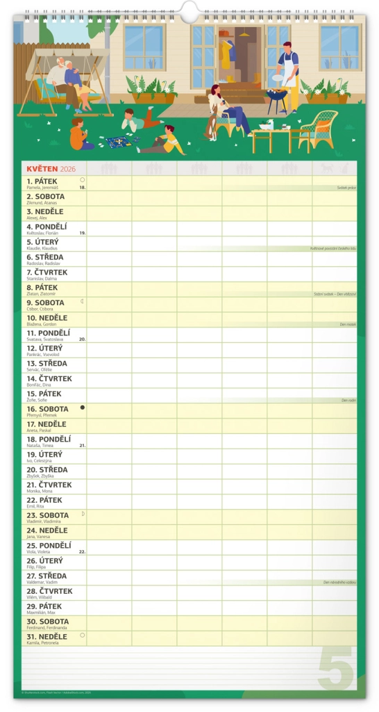 - Kalendář zahrnuje české svátky a jmenné dny.