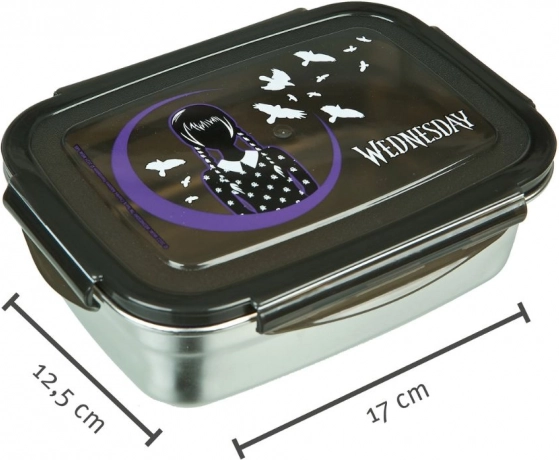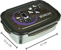 Svačinový box s motivem Wednesday nabízí objem 550 ml, ideální pro obědy a svačiny. Vyrobený z nerezové oceli s průhledným víkem, je odolný a praktický.
