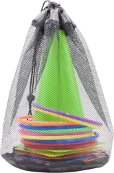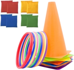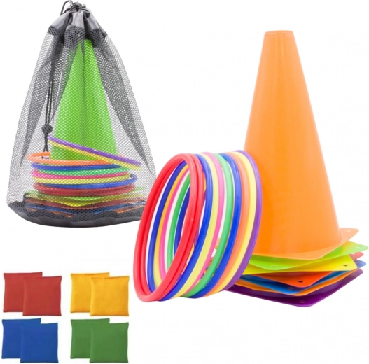 Obsah sady zahrnuje 11 barevných obručí, které jsou vynikající pro hry s házením a dovednostní aktivity, 6 tréninkových kuželů pro překážkové dráhy a 10 gymnastických pytlíků, které lze použít pro smyslové hry, házení nebo jako závaží. Všechny komponenty jsou vyrobeny z trvanlivých a bezpečných materiálů, vhodných pro děti i dospělé.