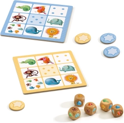 Každý hráč používá svou herní desku, kde si označuje dosažené kombinace žetony s obrázky zvířat. Tento vizuální prvek pomáhá pochopit průběh hry a udržet si přehled o skóre.