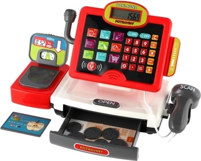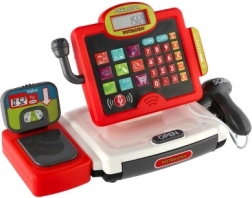 Zábavná a vzdělávací dětská elektronická pokladna s doplňky pro malé obchodníky. Obsahuje světelnou a zvukovou čtečku, makety bankovek a mincí, slot na kreditní kartu, funkční kalkulačku a váhu na ovoce a zeleninu. Ideální hračka pro rozvoj představivosti a základních počtů.
