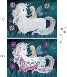 Kreativní sada pro děti s 4 obrázkovými deskami, kde se pomocí samolepicích čtverečků z třpytivé pěny a kamínků vytváří zářivé motivy. Ideální pro rozvoj jemné motoriky, soustředění a trpělivosti. Jednoduché číslované navádění usnadňuje práci a zaručuje okamžitý úspěch i pro začátečníky. Výsledkem jsou třpytivé mozaiky plné barev a fantazie.