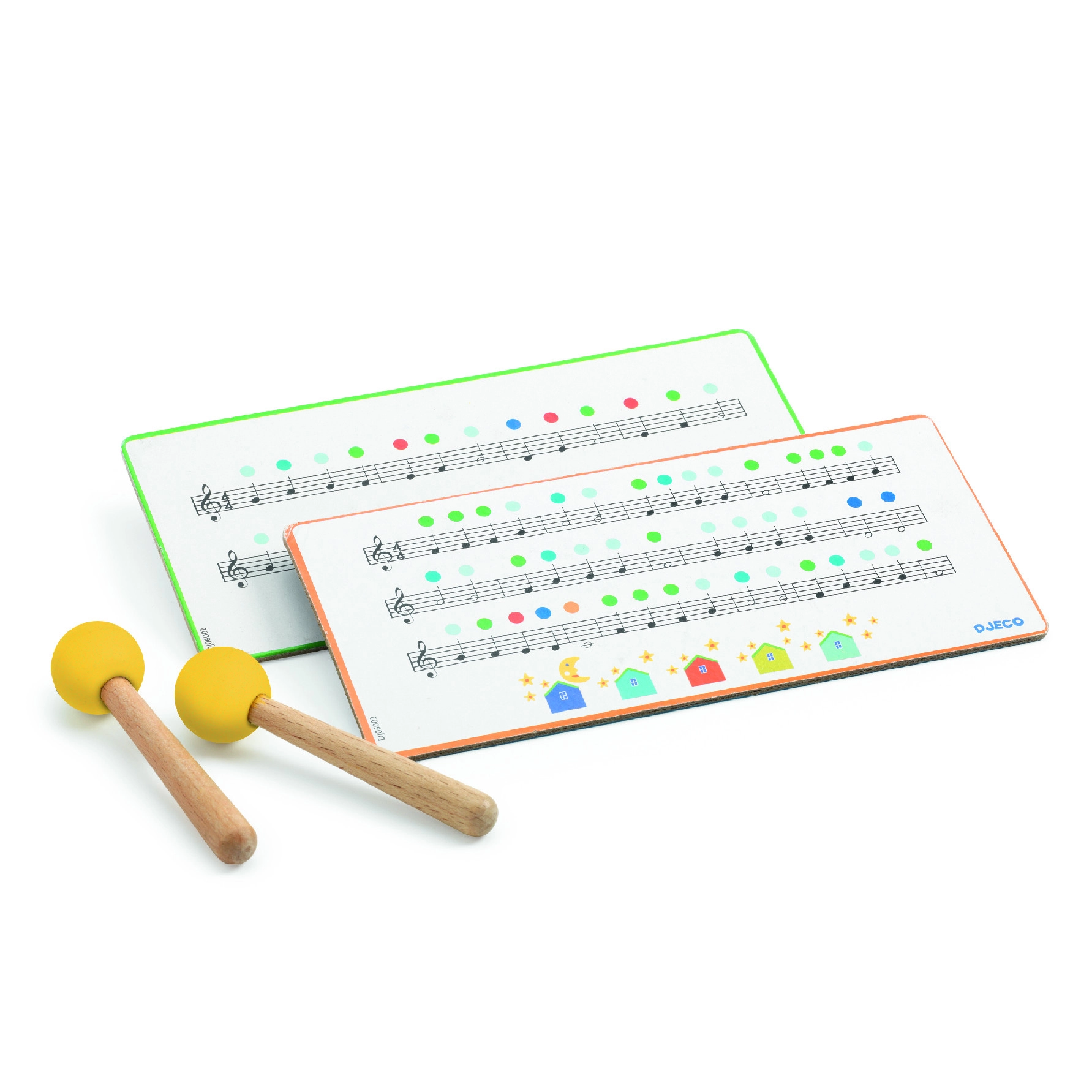 Očíslované jazýčky a přiložené paličky umožní dětem okamžitě hrát příjemné melodie bez předchozí zkušenosti.