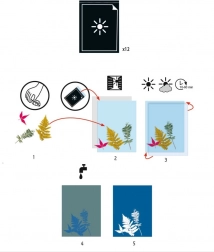 Se sadou fotocitlivých papírů Djeco proměníte sluneční paprsky v kreativní zážitek. Položte na papír přírodní materiály, šablony nebo drobné předměty, nechte působit slunce a po opláchnutí ve vodě se na modrém pozadí objeví jemné stíny a siluety. Jednoduchý proces, ohromující výsledky.