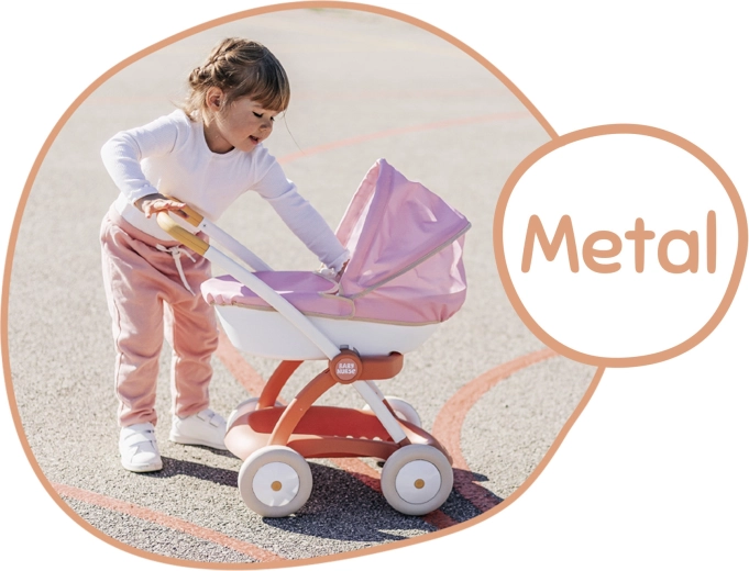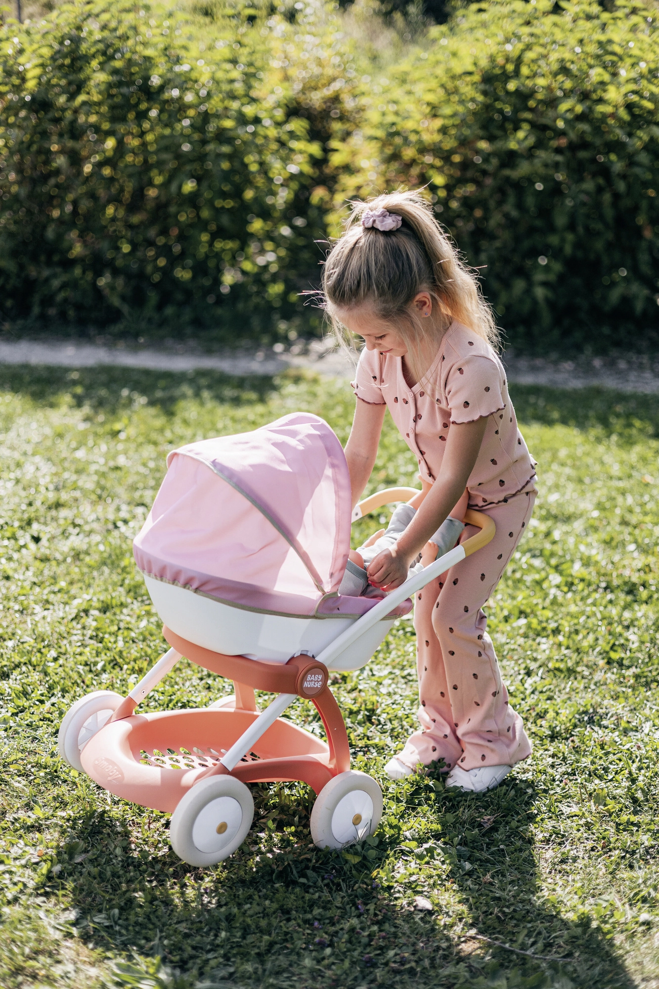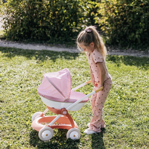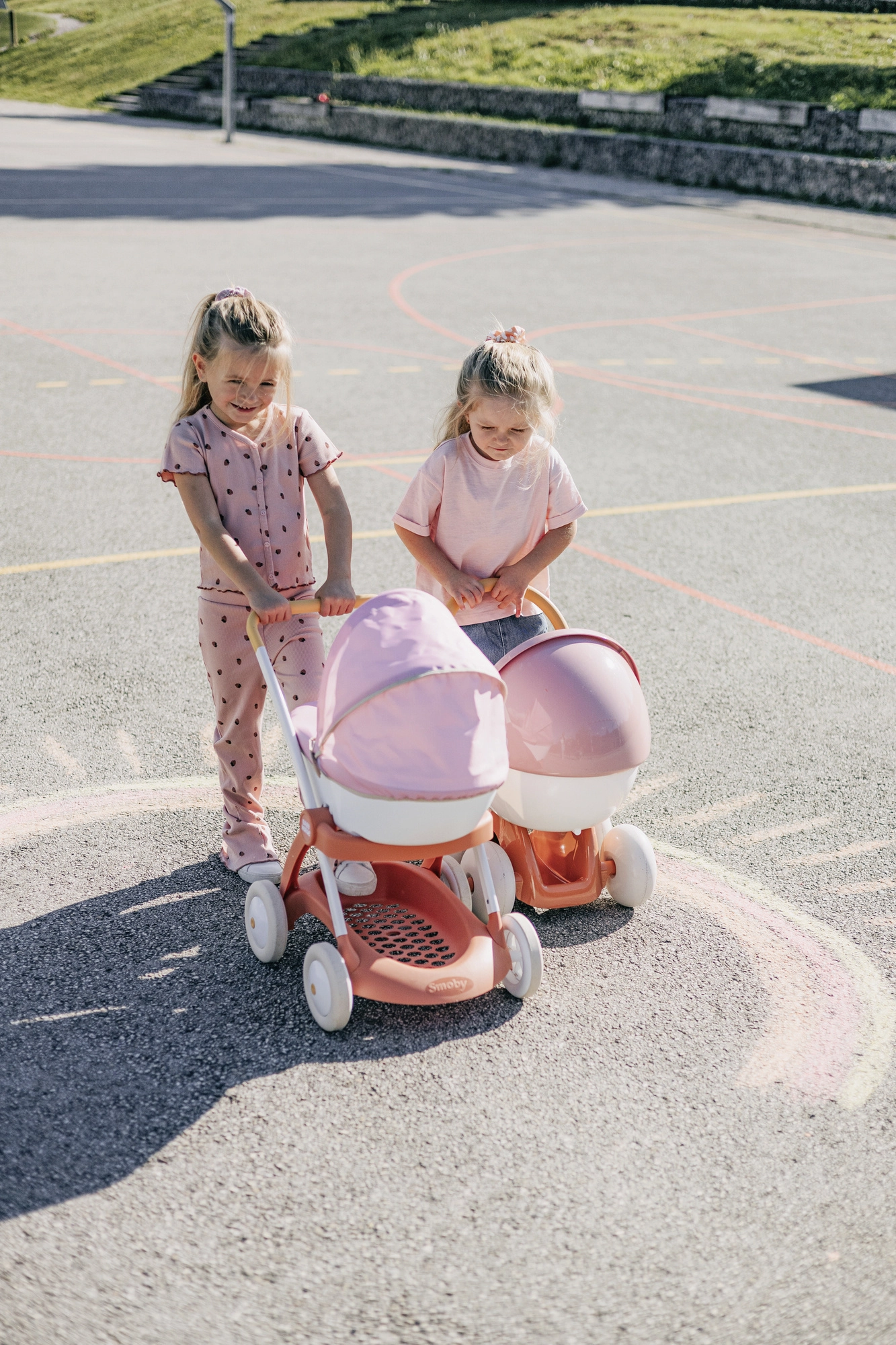 Kočárek pro panenky Smoby Baby Nurse v růžovo-meruňkovo-bílé kombinaci je jako stvořený pro každodenní vycházky s oblíbenou panenkou. Díky kovovému rámu a tichým kolečkům je jízda plynulá a stabilní, zatímco ergonomická rukojeť usnadňuje vedení i menším dětem.