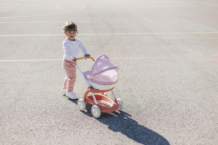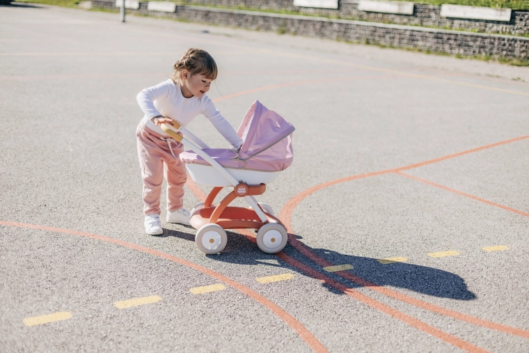 Praktická gondola s plastovou korbou a sklápěcí stříškou chrání panenku před sluncem a větrem. Textilní potah dodává kočárku jemný vzhled a pod korbou najdete úložný koš na doplňky. Hra s kočárkem podporuje pečovatelské dovednosti, představivost a nenápadně rozvíjí motoriku.