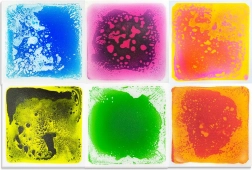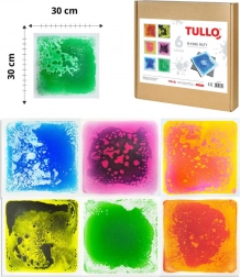 Sada 6 čtvercových tekutých podložek o rozměrech 30x30 cm naplněných netoxickou směsí vody a oleje s živými barvami, ideální pro zábavné a bezpečné smyslové aktivity pro děti.