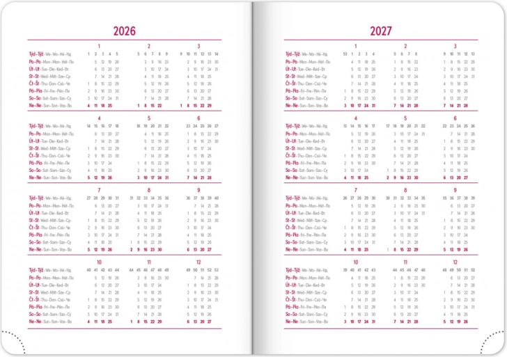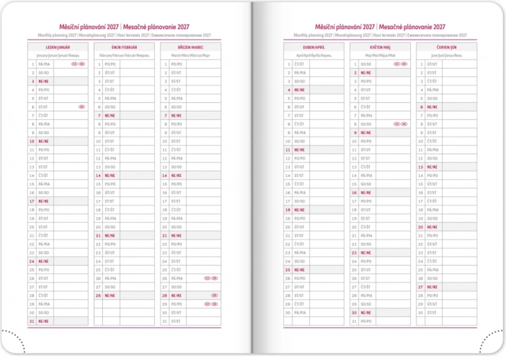 - Obsažené plánovací kalendáře na roky 2026–2027, včetně měsíčních a ročních přehledů.