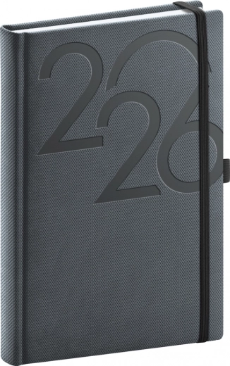 Denní diář Ajax 2026 v elegantní černé barvě s jemně strukturovaným povrchem a atypickým reliéfem je ideální pro profesionály i studenty. Tento praktický diář nabízí nejen denní rozvrh, ale také poutko na tužku a elastickou gumičku.