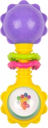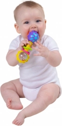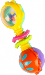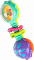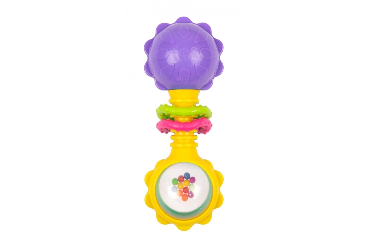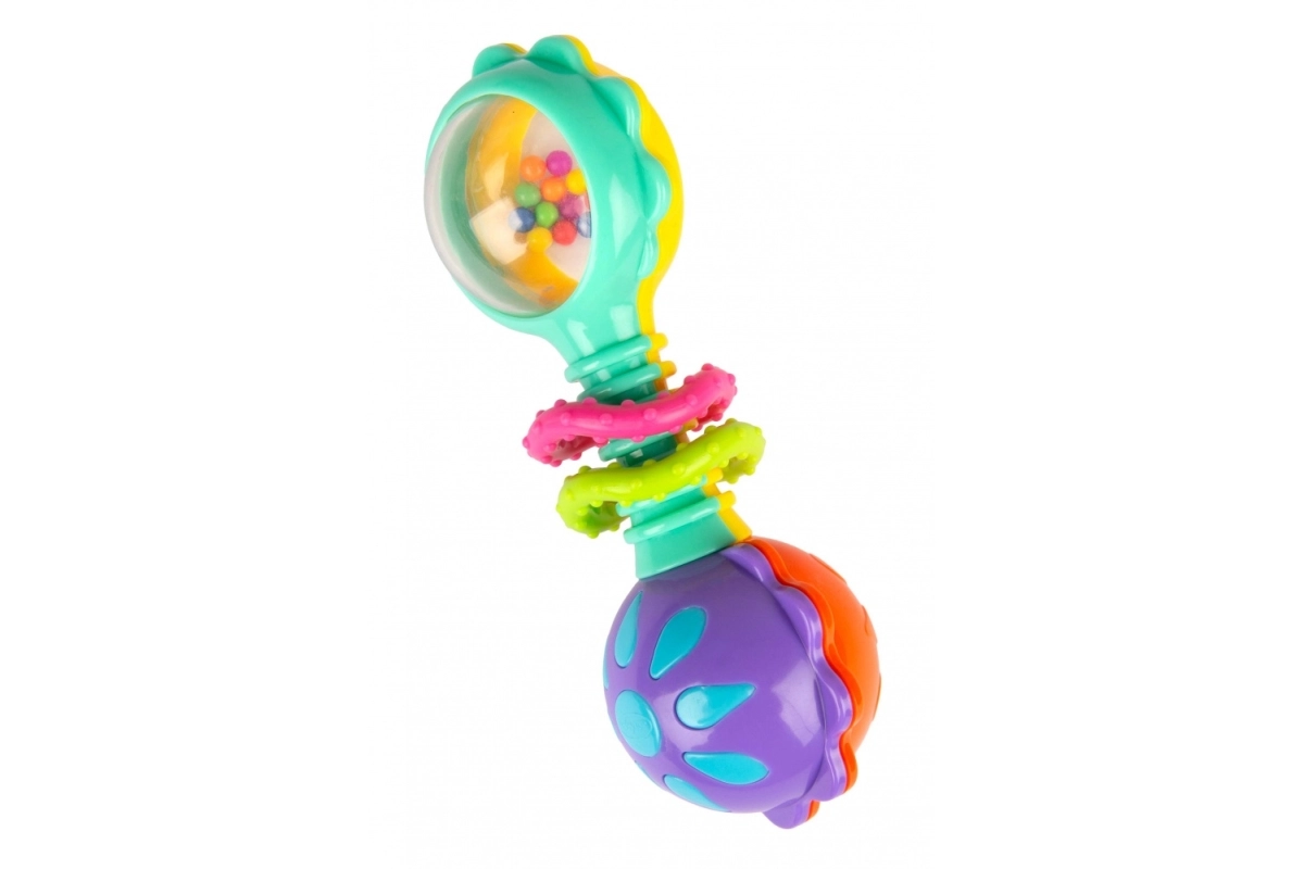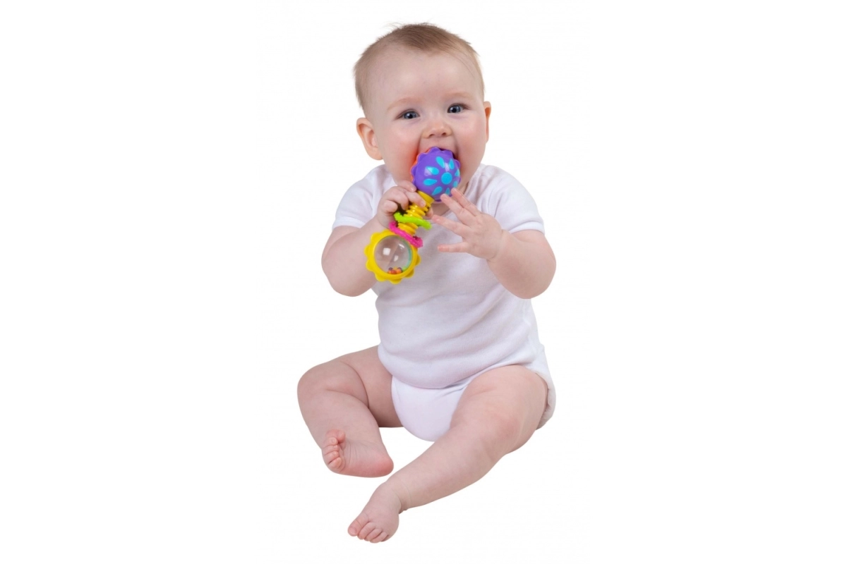 Playgro Dětské kousátko činka je hravá a barevná hračka, která dětem umožňuje snadné uchopení díky ergonomickému designu. Činka vydává při otáčení klik-klak zvuky a při zatřesení chřestivý zvuk, čímž podporuje sluchovou stimulaci a rozvoj motorických dovedností.