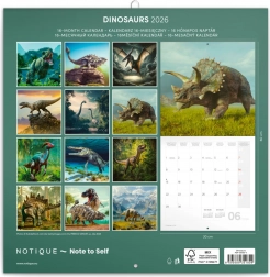 Poznámkový kalendář Dinosauři 2026 nabízí úchvatné ilustrace pravěkých dinosaurů doplněné o praktické šestijazyčné kalendárium, které usnadní vaše každodenní plánování a poznámky.