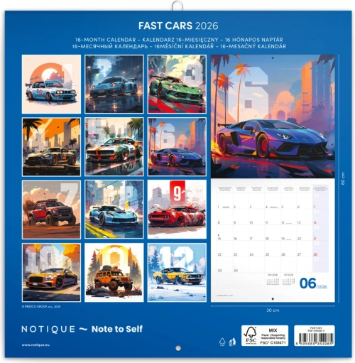 S poznámkovým kalendářem Fantastická auta 2026 se každý měsíc ocitnete ve světě těch nejfantastičtějších aut. Obsahuje kalendárium v šesti jazycích a prostor pro poznámky na každý den.