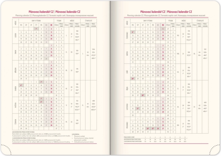 Diář obsahuje denní rozvrh s česko-slovenským kalendáriem a doplňkovými jazyky, včetně angličtiny, němčiny, maďarštiny a ruštiny.