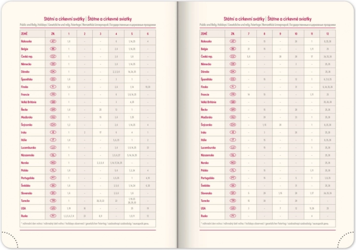 - Zahrnutím svátků České a Slovenské republiky i mezinárodních svátků pro vaši lepší orientaci.