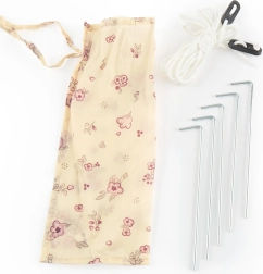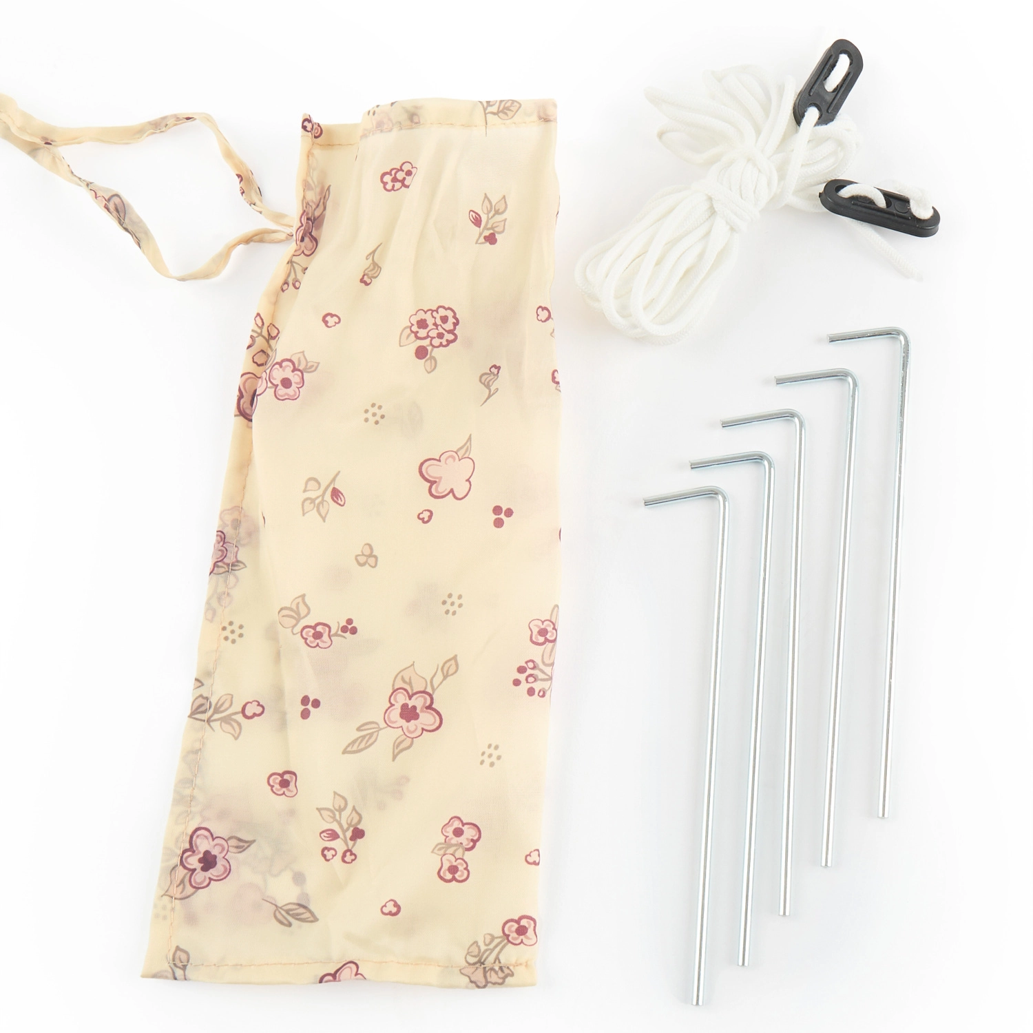 Obsah balení zahrnuje plážový stan, dvě úložné tašky, čtyři stanové kolíky a kotevní lana. Rozměry stanu jsou 130 x 115 x 130 cm a je vyrobený z 100% polyesteru.