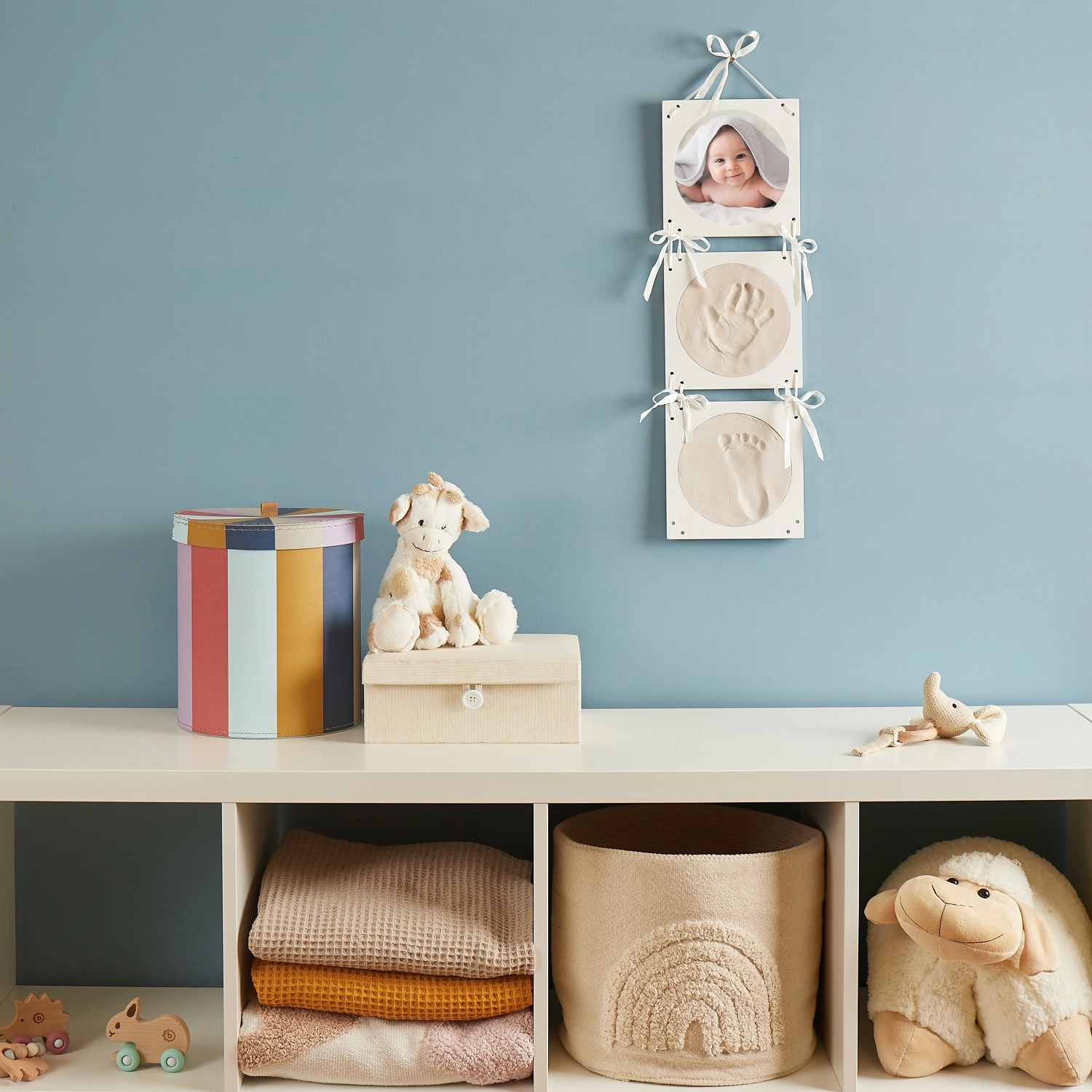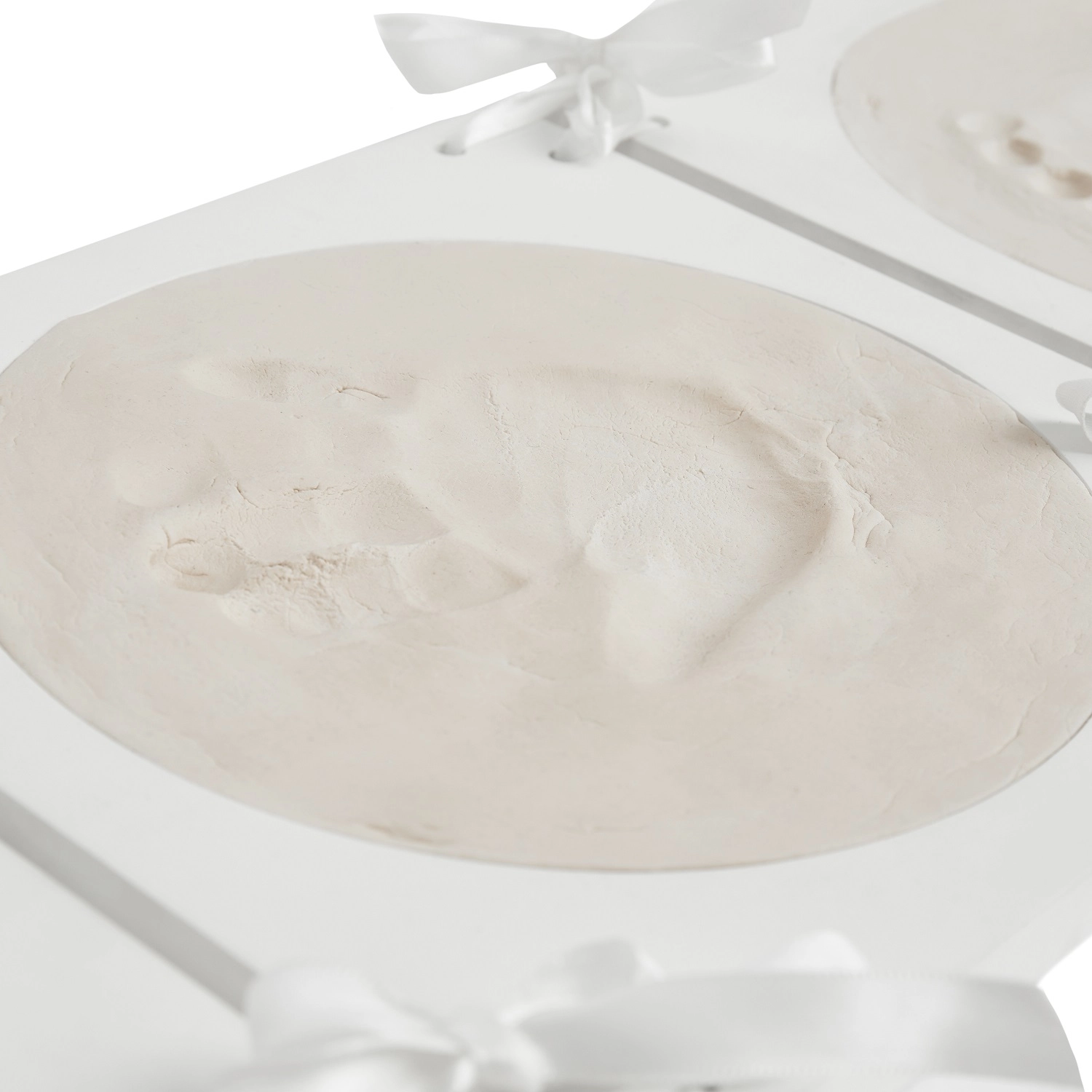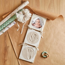 Zachyťte kouzelné okamžiky s touto sada pro otisky dětských ručiček a nožiček. Sada nabízí elegantní kulaté rámečky se třemi okénky. Obsahuje prostor pro dva otisky a jednu fotografii vašeho miminka.