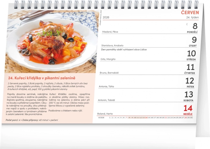 Objevte 53 receptů inspirovaných středomořskou kuchyní s naším stolním kalendářem pro rok 2026. Užívejte si každý týden nový recept a mějte přehled o svátcích, pamětných dnech a fázích měsíce.