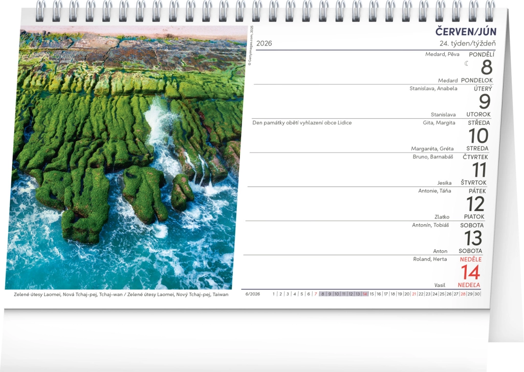 Kalendář má rozměry 23,1 x 14,5 cm, což je ideální velikost pro váš pracovní stůl.