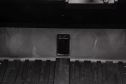 - Otevírací dveře s blokací a bezpečnostními pásy na dvojitém sedadle pokrytém černou ekokůží.